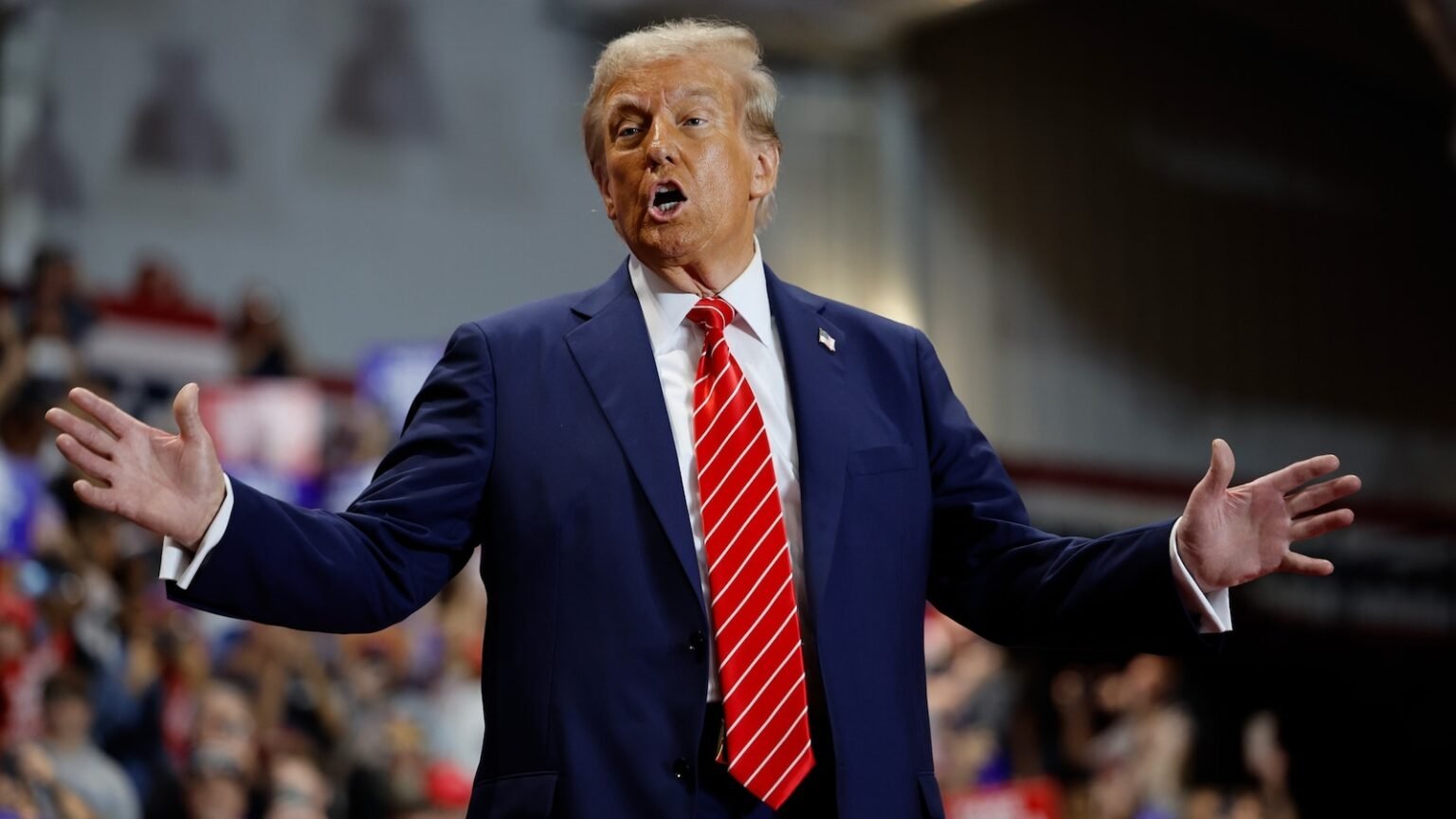 Republican presidential candidate former President Donald Trump gestures during a campaign rally on October 29, 2024 in Allentown, Pennsylvania.