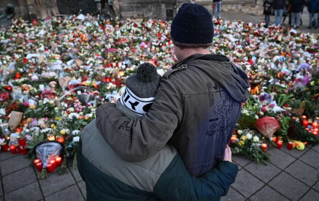 Mourners hug in front of a makeshift memorial made of flowers and candles for the victims of a car crash at a Christmas market in Magdeburg, eastern Germany, on December 23, 2024.