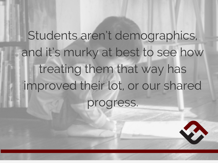 So it’s a brutally narrow view of how people come together and unite and manifest their vision of what it means to be human, but the point remains: as educators, we suffer from the same reductionism when we see the masses the same way that Nielsen makes the TV ratings. Students are not a demographic, and it is murky at best to see how treating them this way has improved their situation or our overall progress.