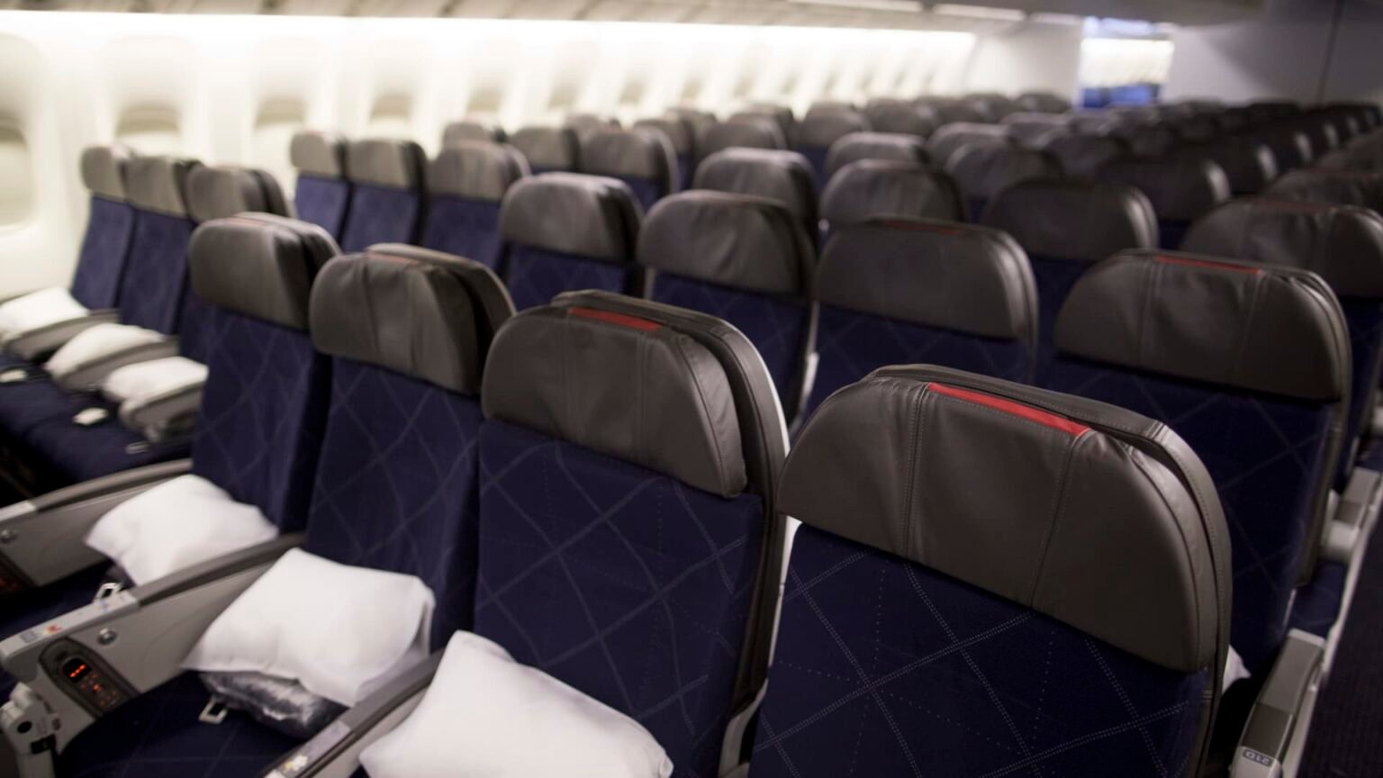 Seats in the economy class cabin American Airlines Boeing Co. on a 777-300ER aircraft.