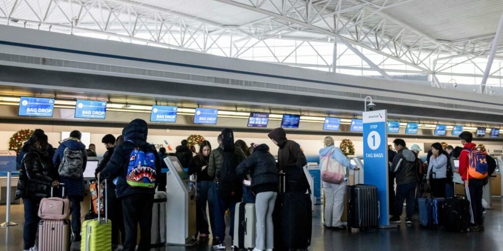 Passengers in the American Airlines check-in area at John F. Kennedy International Airport (JFK) in New York, USA, on Tuesday, December 24, 2024. American Airlines Group Inc. said a technical error by vendors was the cause of the shortfall. All US flights stop on Christmas Eve, one of the busiest days of the holiday travel season.