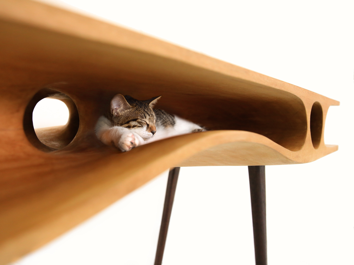 The original CATable brings a cat’s perspective to the interior of the table. The design incorporates pathways, tunnels and chambers built directly into the table structure. Cats can enter through various openings, navigate internal passageways, and exit from different locations, all while their owner works on the surface above.