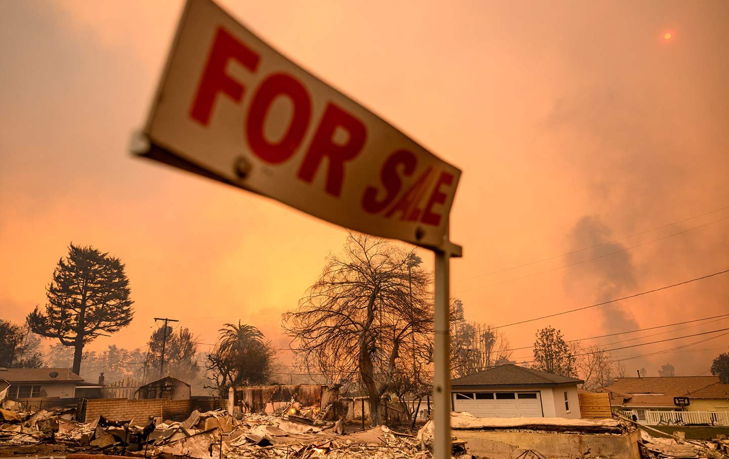 A for sale sign remains as homes smolder during the Eaton Fire in the Altadena neighborhood of Los Angeles County, California on January 8, 2025.