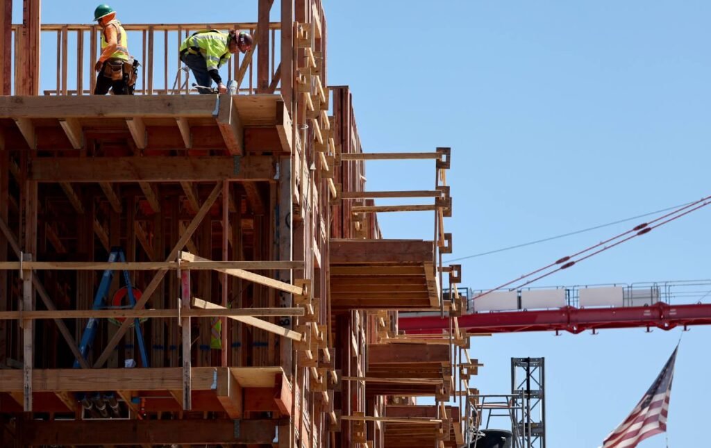 Construction continues on the residential complex of mixed use, which will have more than 700 housing and 95,000 square feet commercial squares, on August 20, 2024 in Los Angeles, California.