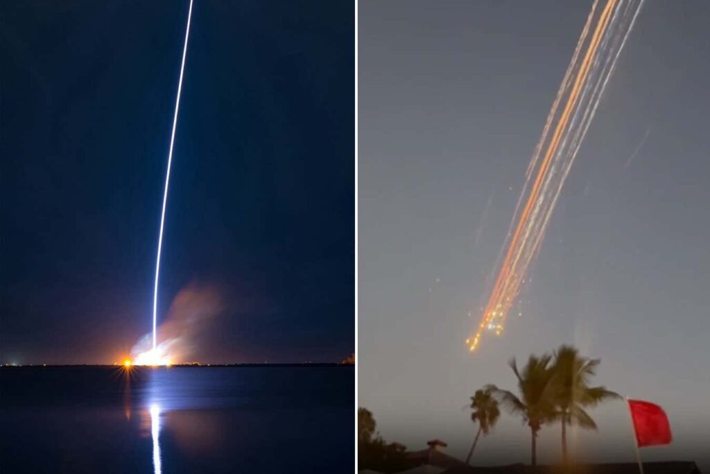 New Glenn reached orbit (left), but the Starship exploded, raining debris (right)