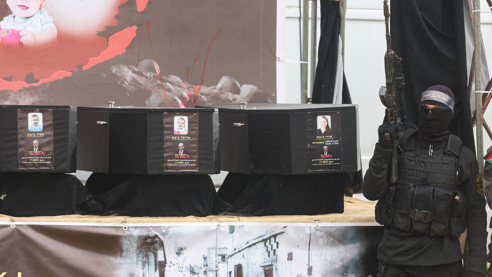 Red Cross officials cared for four black coffins in the southern Gaza City of Khan Younis. The Red Cross Officer and a commander Hamas appeared in a stage to sign documents. The coffins were also taken to the stage.