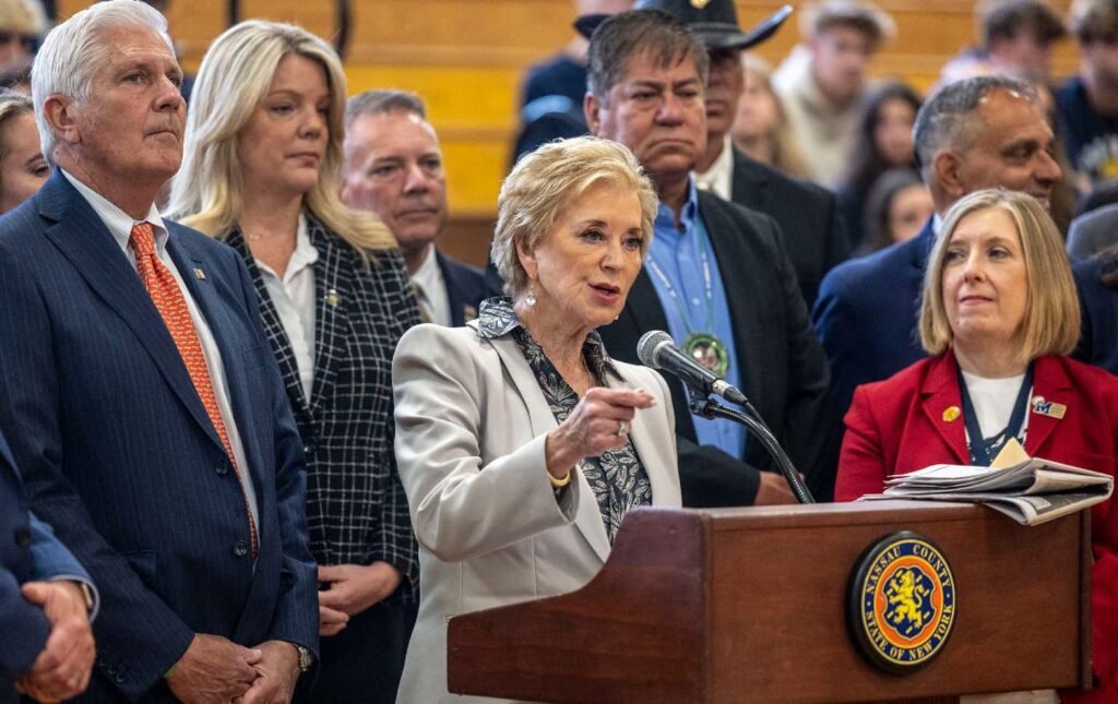 Education Secretary Linda McMahon speaks during a press conference at the Massapequa High School on May 30, 2025, discussing the ban on New York on the mascots of Indians.