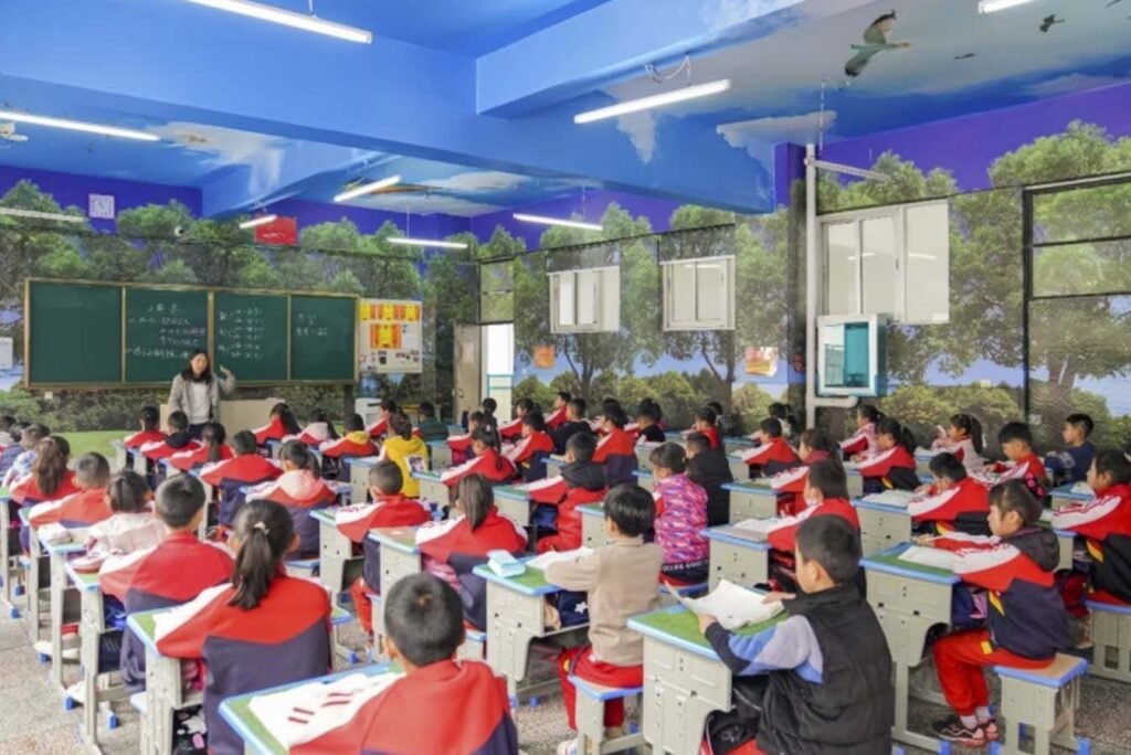 In the province of Yunnan, Lijiang, China, a classroom decorated within a test of myopia