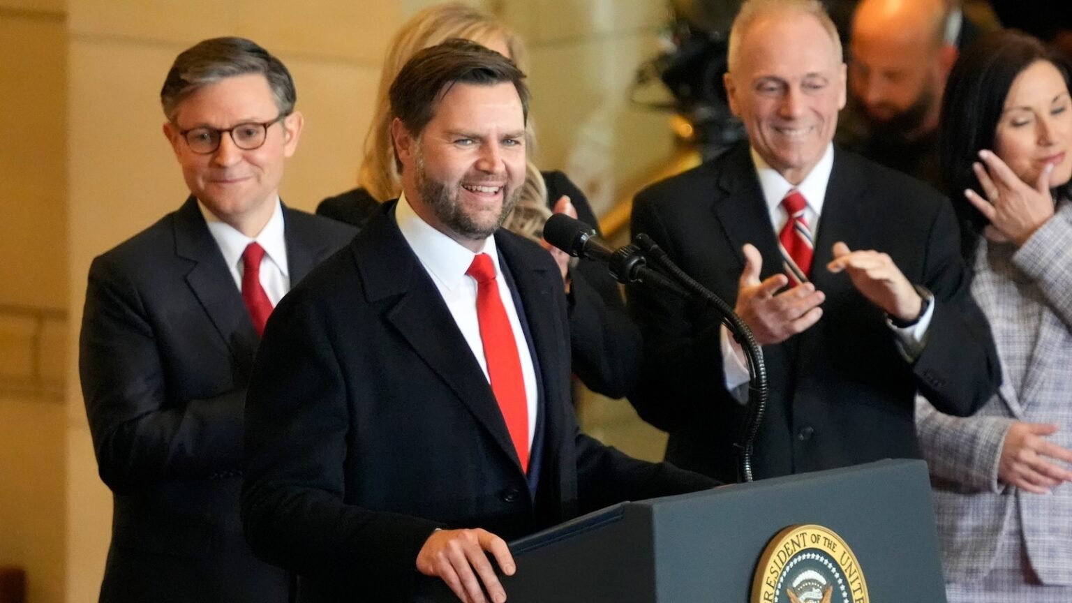 Vice President JD Vance makes remarks as House Speaker Mike Johnson (R-LA) and U.S. House Majority Leader Steve Scalise (R-LA) look on in the Emancipation Hall viewing area for Donald J. Trump’s inauguration. The Rotunda of the US Capitol on January 20, 2025 in Washington