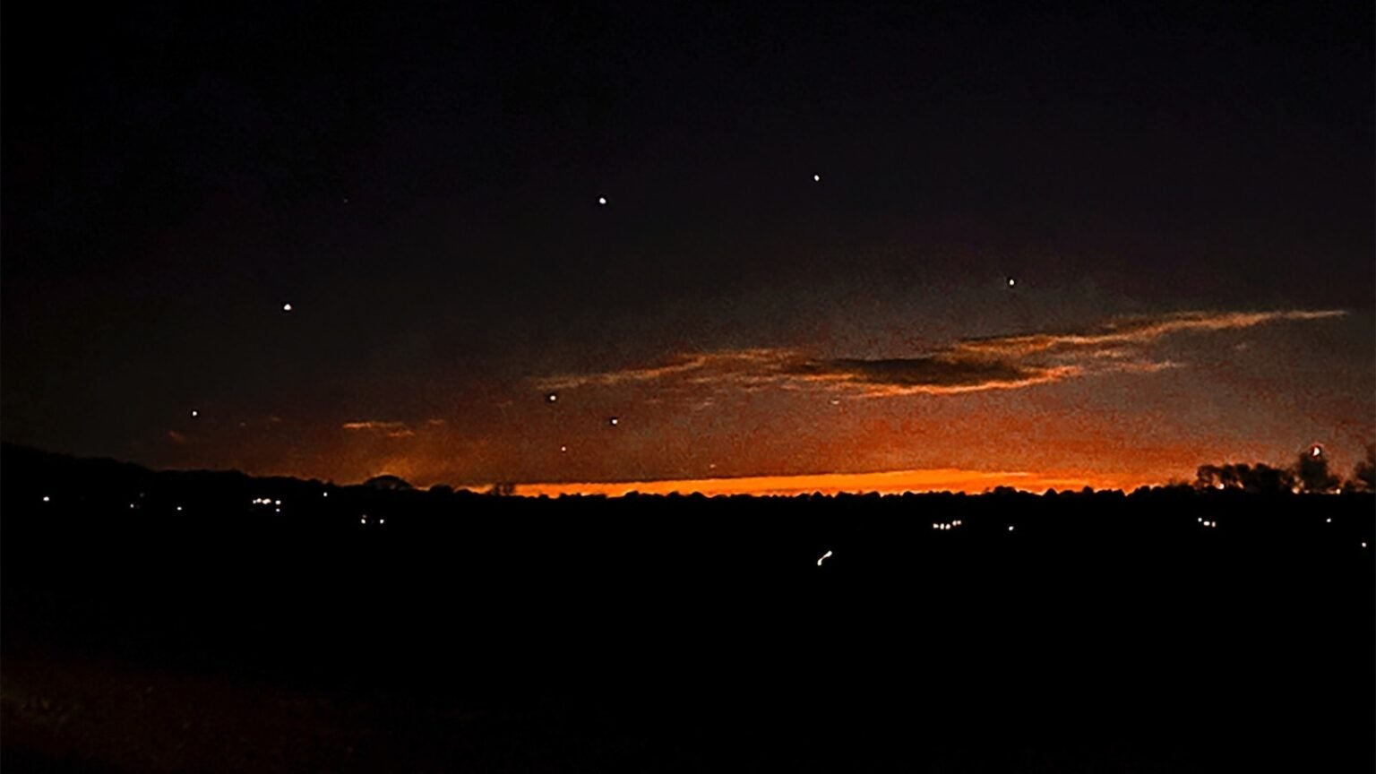 In this image from the video, what appear to be drones flying over Randolph, NJ on December 4, 2024.