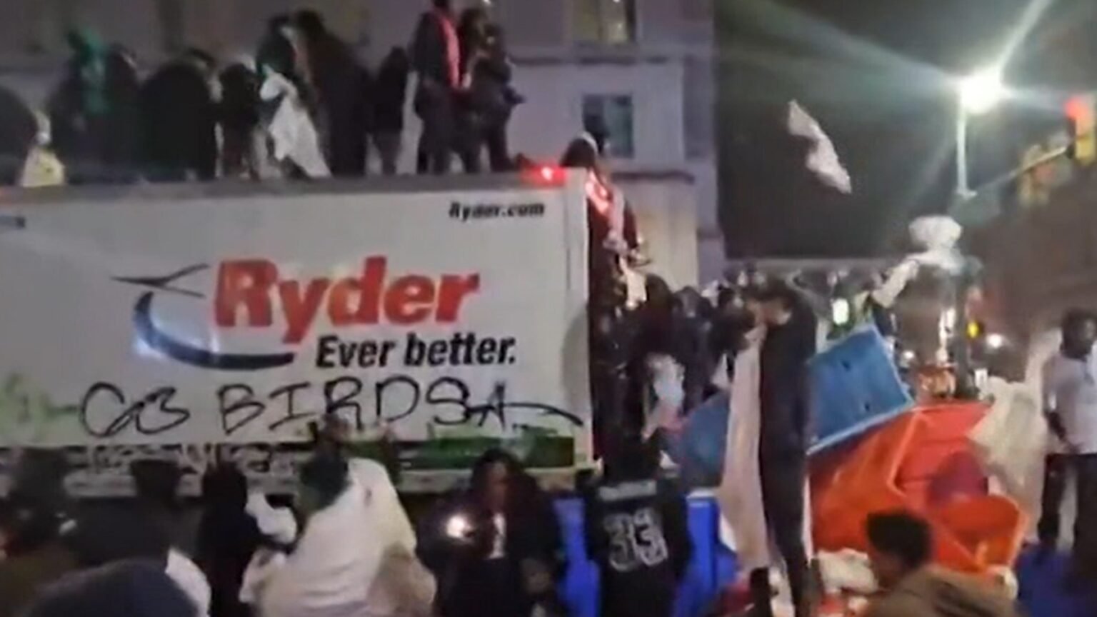 Check out the video purchased by TMZ … Eagles buffs robbed trucks filled with linens before I threw them in the air and brighten them in the middle of the road.