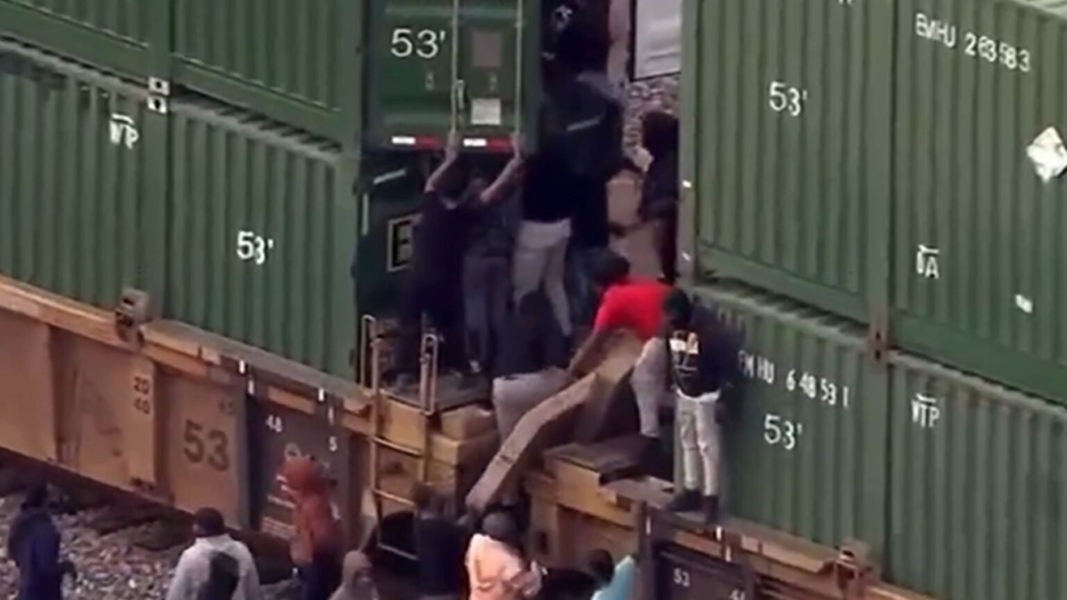 Dozens of brazen thieves rode a Chicago freight train to steal as much as they could carry… and the scene was caught on camera.