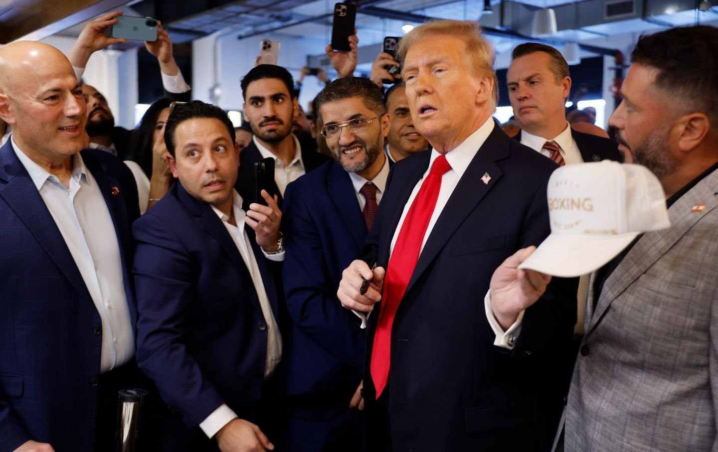 Republican presidential candidate former President Donald Trump visits The Great Commoner Cafe with Hamtramck, Michigan Mayor Amer Ghalib standing to his right on November 1, 2024 in Dearborn, Michigan.