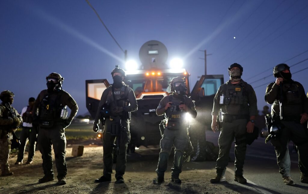 On July 10, 2025, federal agents block people protesting against immigration raid on a neighboring Licensed Cannabis farm near Camarila, California.