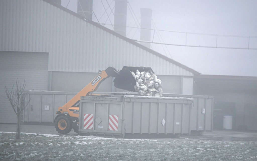Wheel forklifts tell a dead turkey in a container killed due to a bird flu outbreak in Baden-Würthemberg, Iloshefen, January 15, 2025.(Jason Tschepljakow / Alliance Picture Alliance through Getty Images)