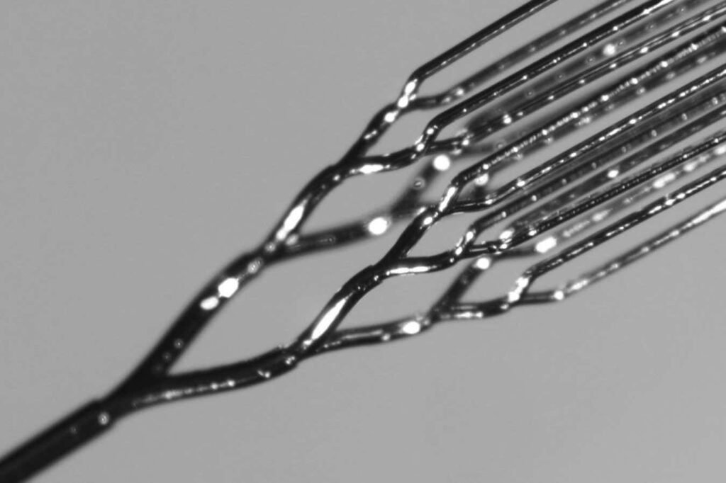 A gallium mold used to make a channel system in a soft gel, imitating blood vessels