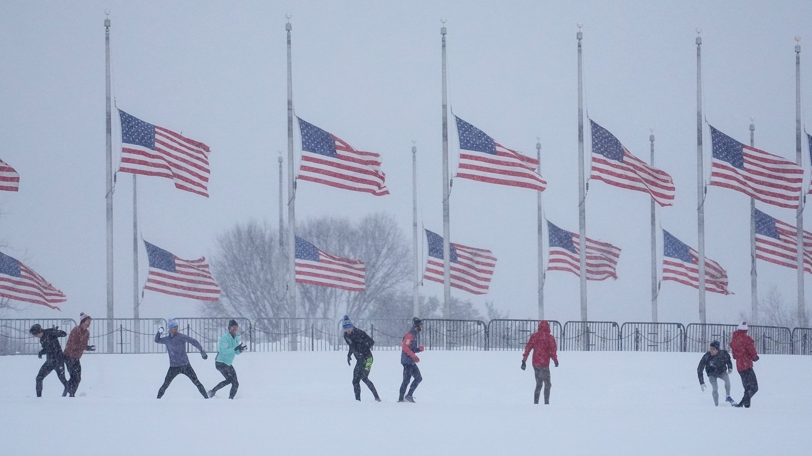 People participate in a snowball fight in Washington, D.C., on Jan. 6, 2025, as the U.S. flag flies at half-staff at the base of the Washington Monument in memory of former President Jimmy Carter, who died at the age of 100.