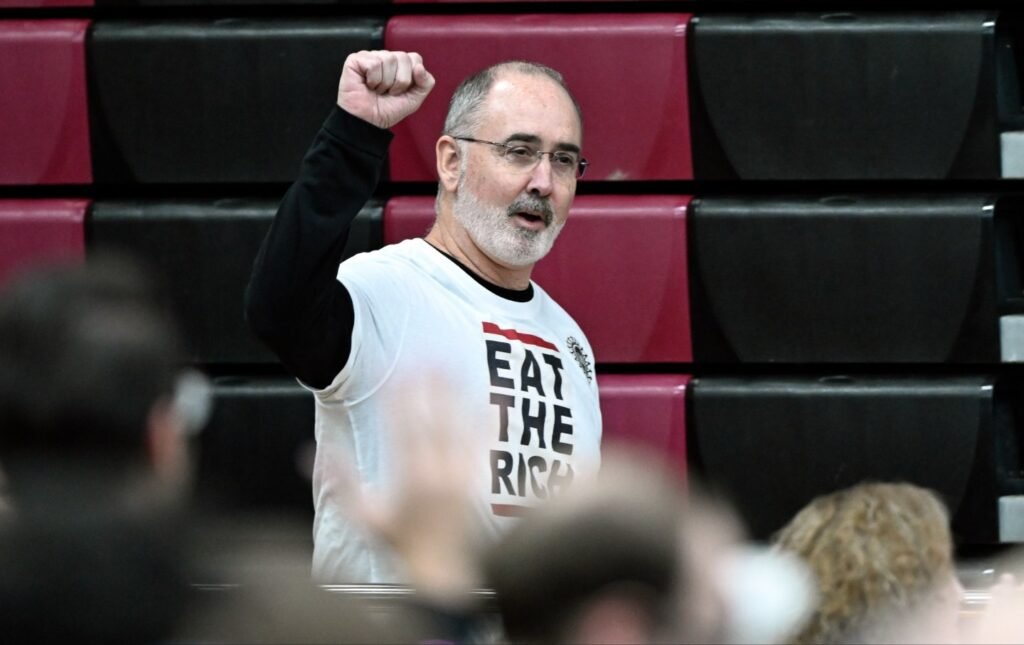President UNITED AUTO WORCERS SHON FINE admits the crowd when he heads on stage to introduce Senator Bernie Sanders, I-VT., During A "Fighting the oligarchy: where we come from here" The event on Saturday, March 8, 2025, at the Lincoln High School in Warren, Michigan.