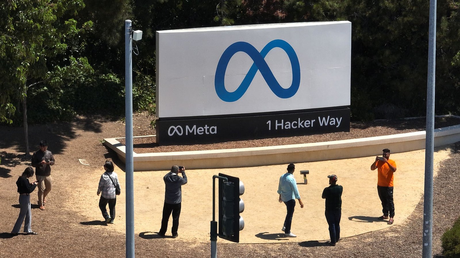 In an aerial view, people gather in front of a poster at the Meta headquarters in Menlo Park, California, on July 7, 2023.