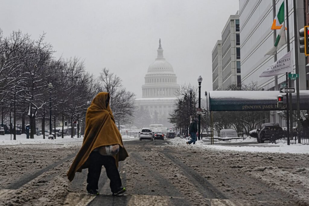 A homeless person walks near the US Capitol during a snowy January 6, 2025 in Washington, DC