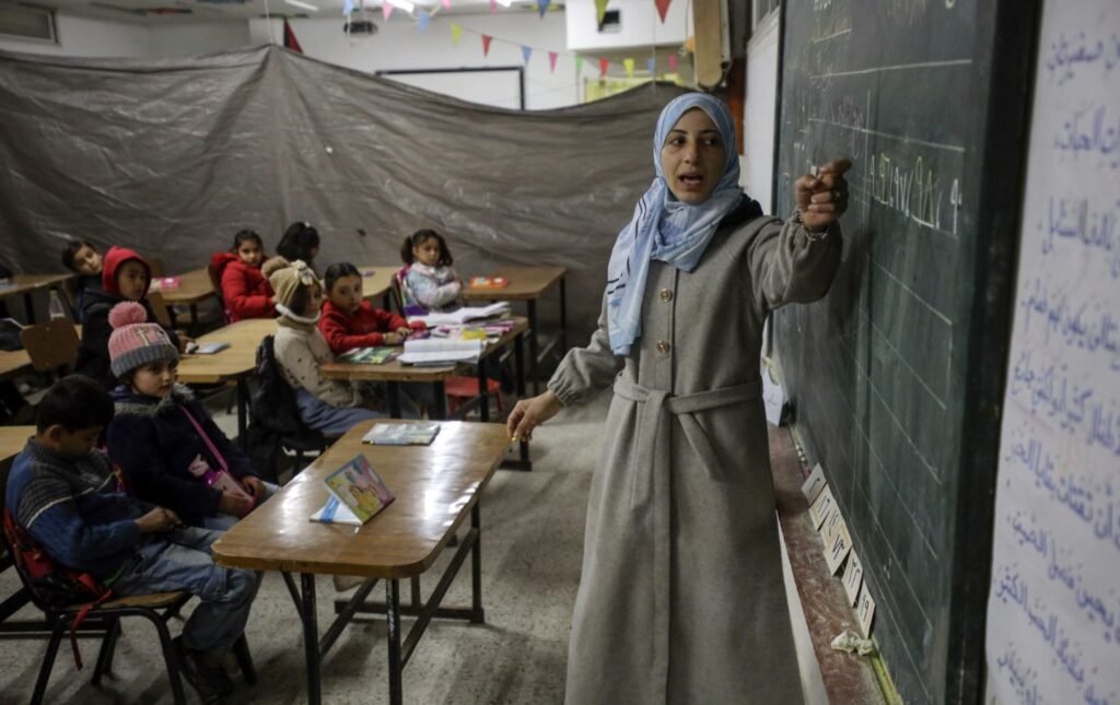 Palestinian children attend a classroom lesson in a damaged school in Gaza, February 26, 2025.