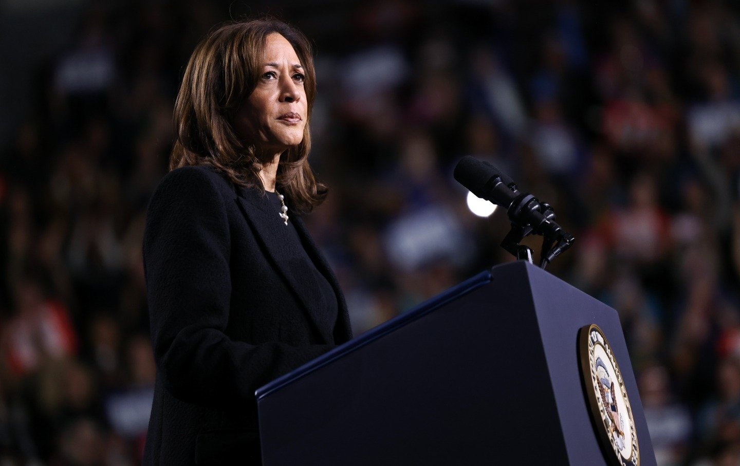 Vice President Kamala Harris looks brilliant against a dark background, on the podium.