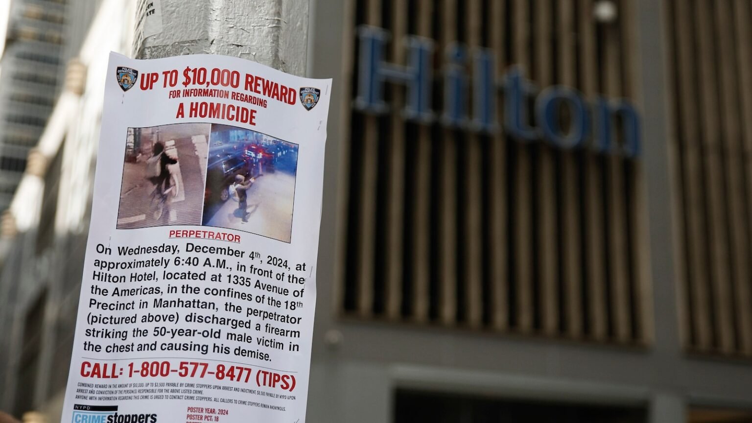 A reward sign hangs outside the Hilton Hotel in midtown Manhattan where UnitedHealthcare CEO Brian Thompson was shot and killed on December 4, 2024 in New York City.