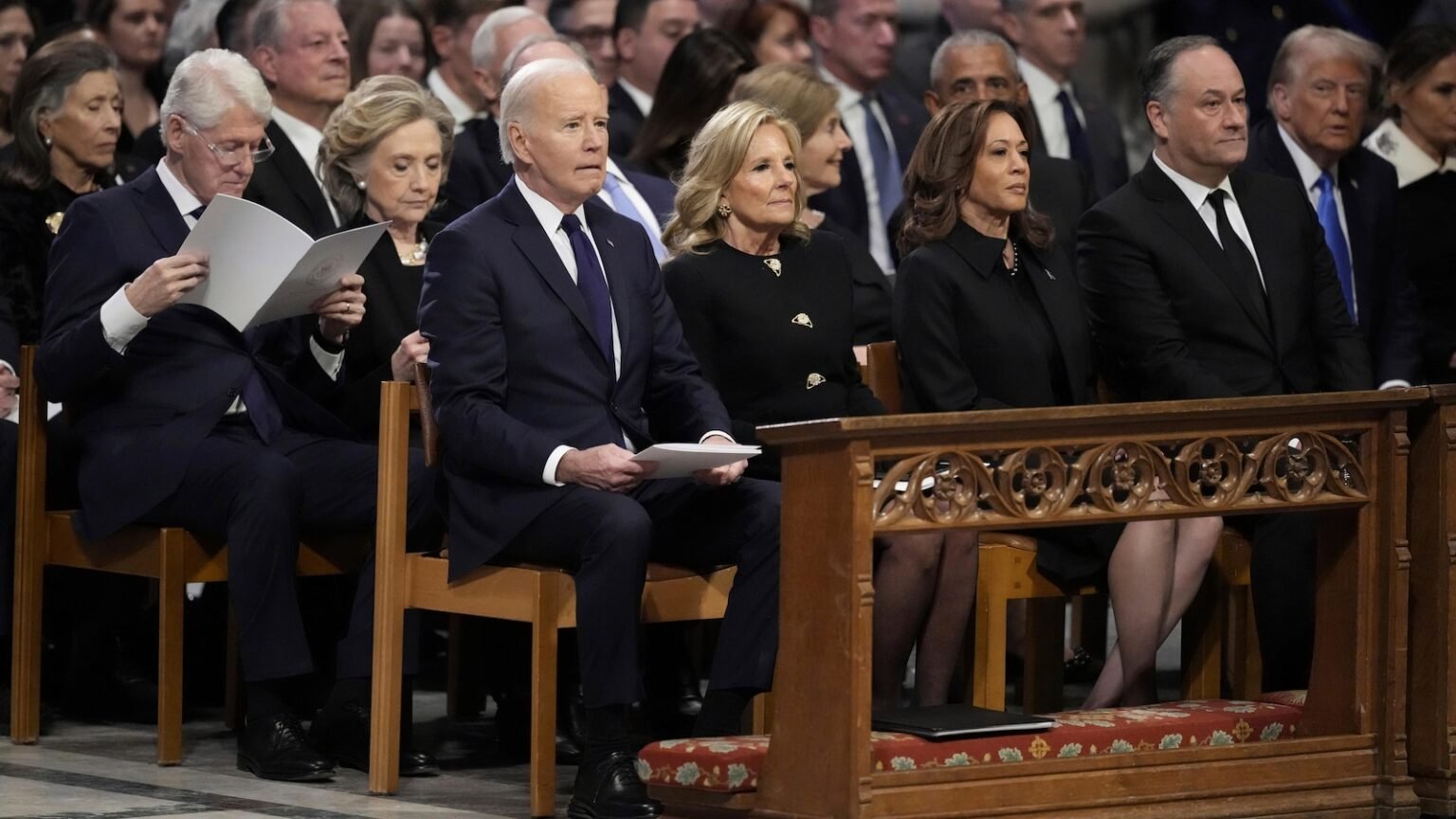 President Joe Biden, First Lady Jill Biden, Vice President Kamala Harris, Second Lord Doug Emhoff, Former President Bill Clinton, Former First Lady Hillary Clinton, Former President George W. Bush, Former First Lady Laura Bush, Former President Barack Obama, Former President and President-elect Donald Trump, former First Lady Melania Trump, former Vice President Al Gore, former Vice President Mike Pence and others attend the funeral of former President Jimmy Carter at the Washington National Cathedral. In Washington, Thursday, January 9, 2025. (AP Photo/Ben Curtis)