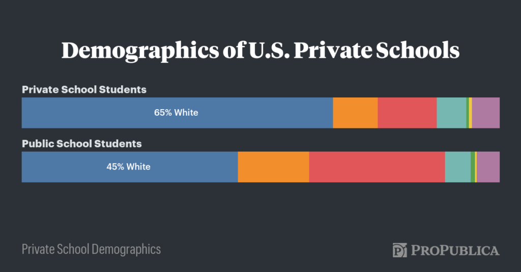 Private schools in the United States are generally whiter than public schools and have fewer black, Hispanic, or Latino students.