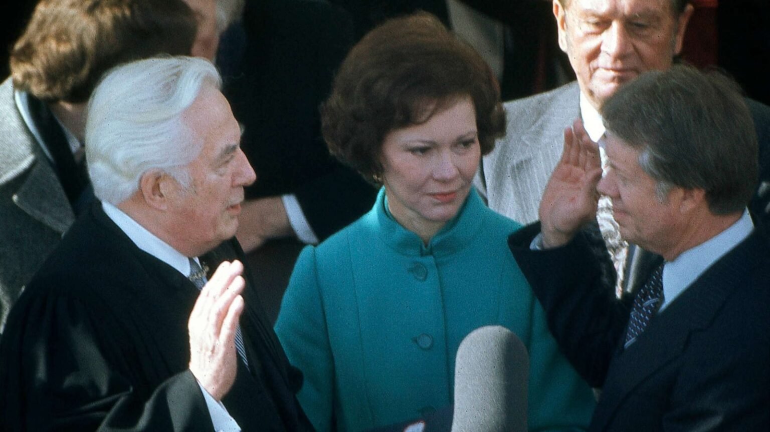 President Jimmy Carter, with his wife Rosalyn Carter, was sworn in by Supreme Court Chief Justice Warren Burger on the stage in front of the White House in January 1977.