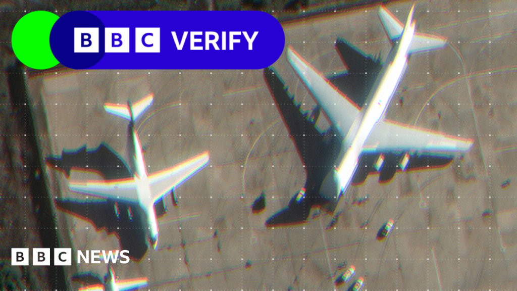 BBC Verify has been tracking one large Russian An-124 since Tuesday on aircraft tracking website Flightradar24. Its publicly available tracker showed it was flying over Russian airspace in the direction of Syria. It then disappeared from Flightradar24 off the coast of Syria, west of Khmeimim Air Base, probably because its public tracker was disabled. Then six hours later it can be seen returning to the north.