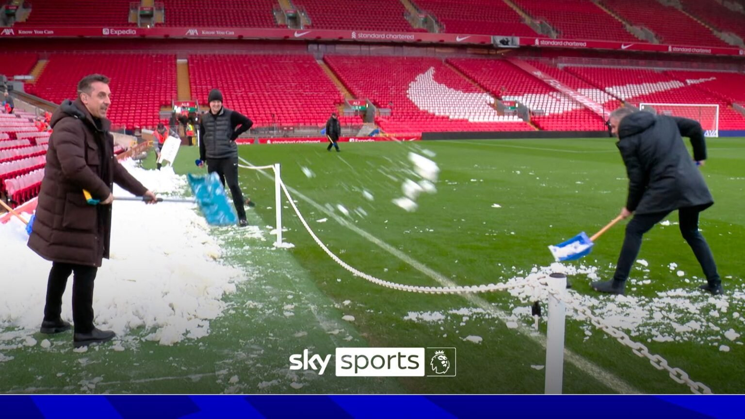 Former Manchester United defender Gary Neville shovels snow onto the Anfield pitch and former Liverpool defender Jamie Carragher clears it away ahead of the huge game between Liverpool and Manchester United.