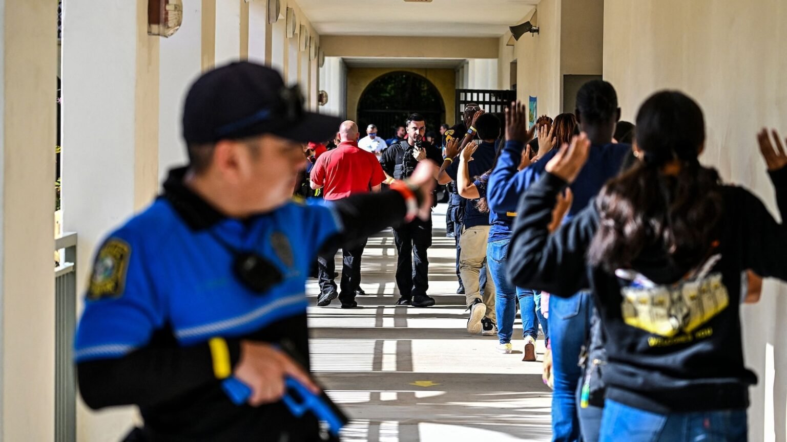 Miami-Dade Schools Police conduct a rescue operation during a “Large Scale Functional Active Shooter Drill” on August 14, 2023 at Miami High School in Miami.