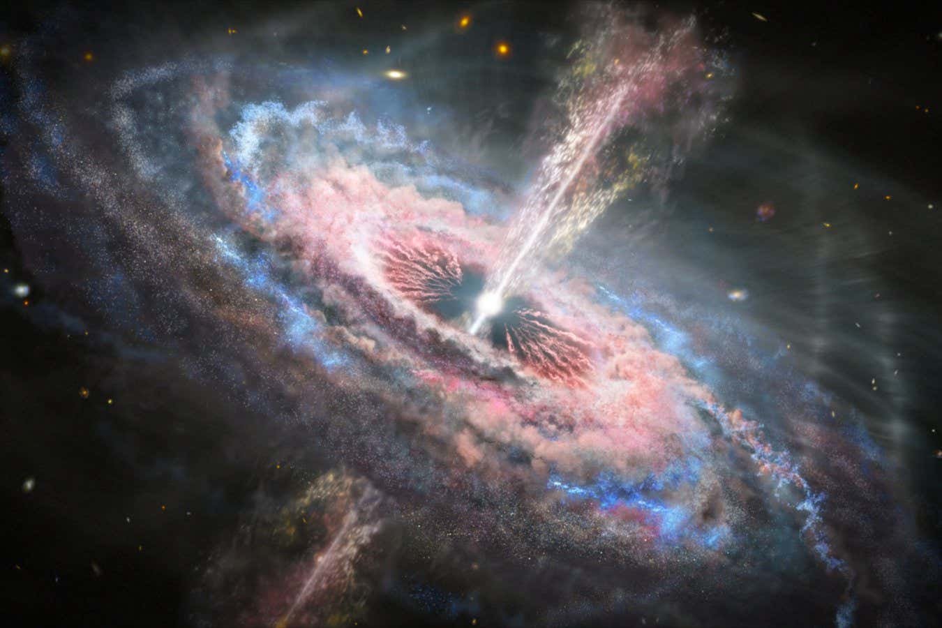 Artist’s rendering of a galaxy with a bright quasar at its center