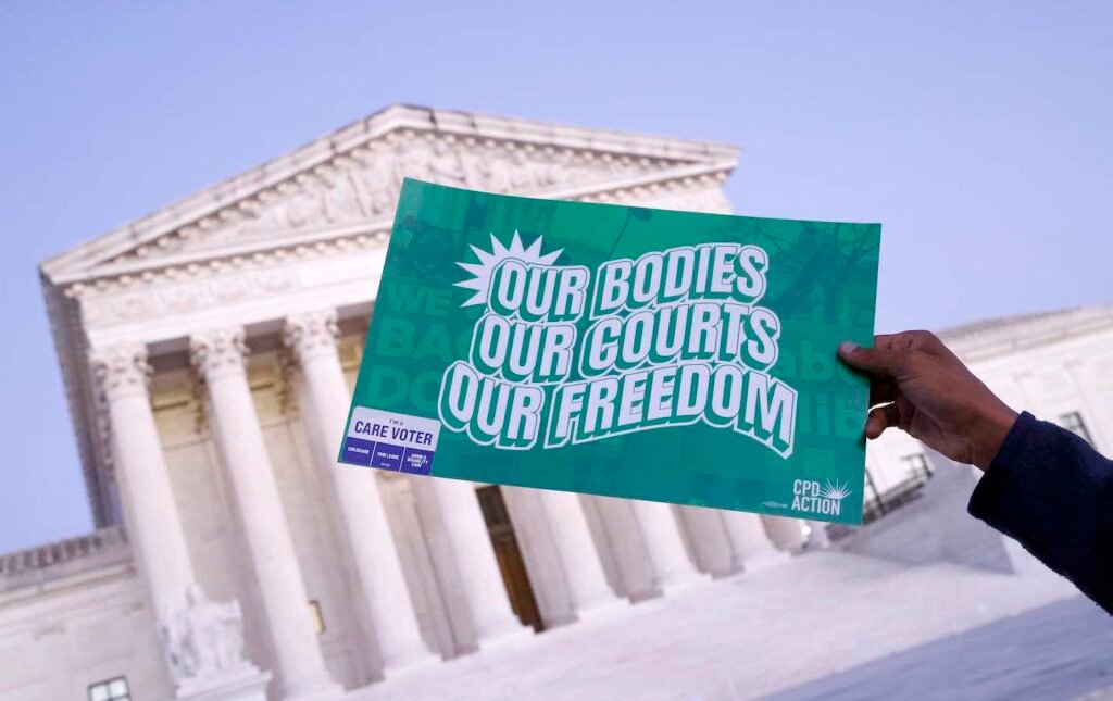The organizer of the Permanent Current Community has a sign for a light brigade for reproductive justice: your voice is your voice outside the US Supreme Court on October 17, 2024.
