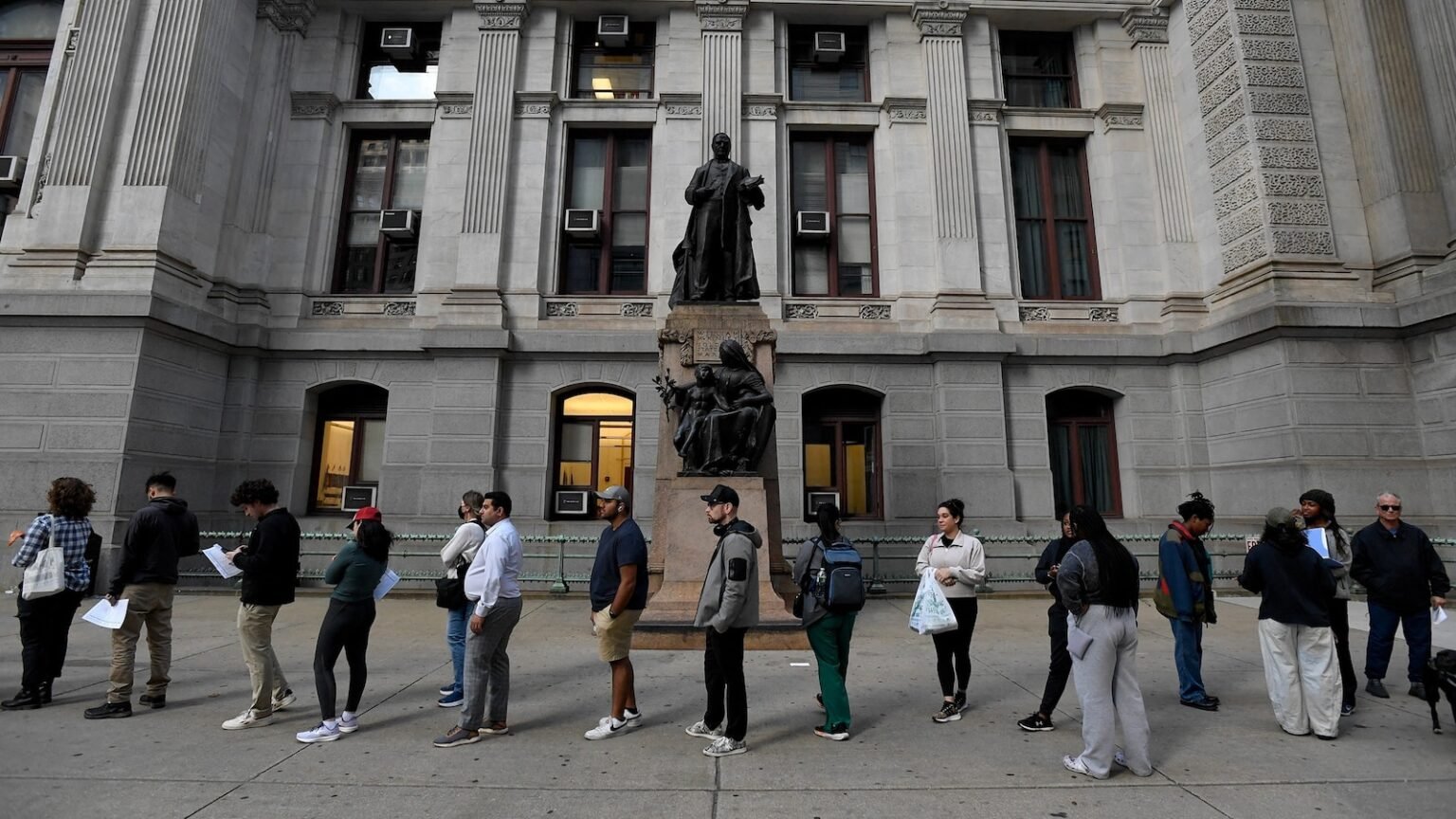 Residents wait in line around City Hall to cast their ballots on the last day of voting in Philadelphia, Pa., on Oct. 29, 2024.
