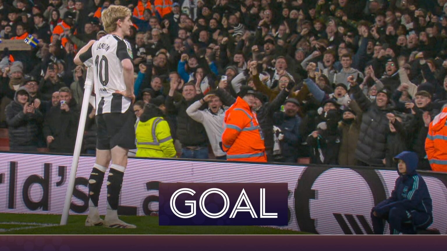 Alexander Isak has a shot that is pushed back by Raya before Anthony Gordon follows up to double Newcastle’s lead over Arsenal.