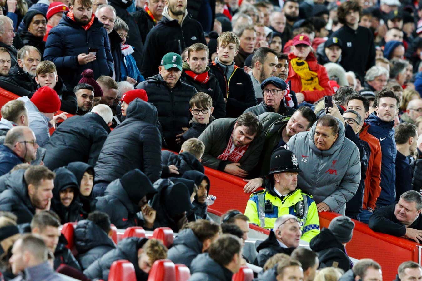 Liverpool fans take a look at the VAR screen on the pitch at Anfield Stadium