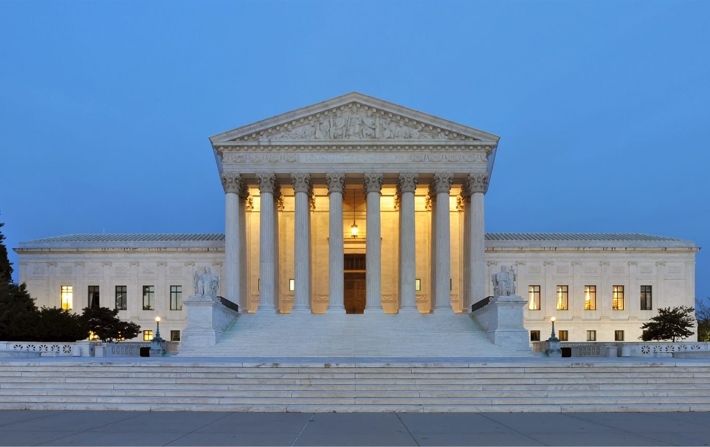 The western facade of the Supreme Court building in Washington, the District County, at dusk.