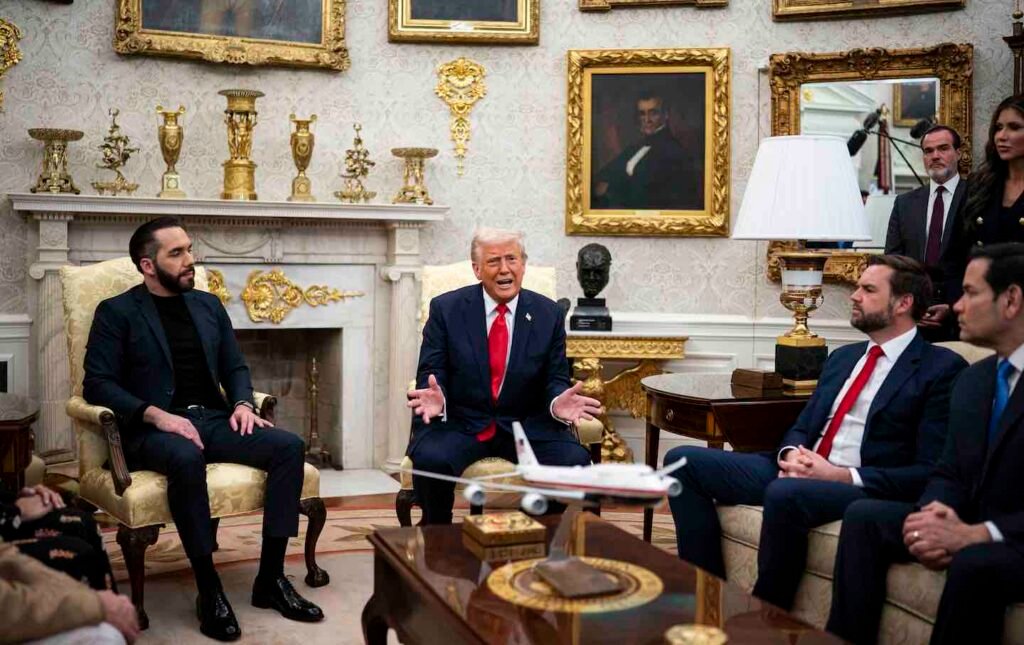 US President Donald Trump, in the center of the right, and Naib Bokele, President of Salvador, in the center, during a meeting in the Oval House in Washington, Colombia, April 14, 2025.