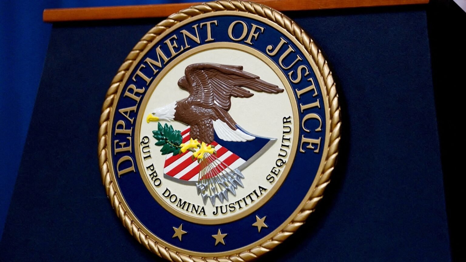 The seal of the U.S. Department of Justice is seen on a podium in the briefing room at the Department’s headquarters before a news conference with the attorney general on Jan. 24, 2023 in Washington.