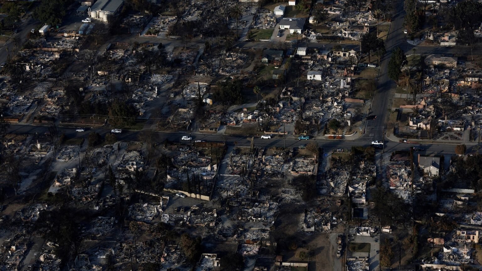 An aerial view of the fire damage caused by the Eaton Fire is shown in Altadena, California. 2025, 22, 22.