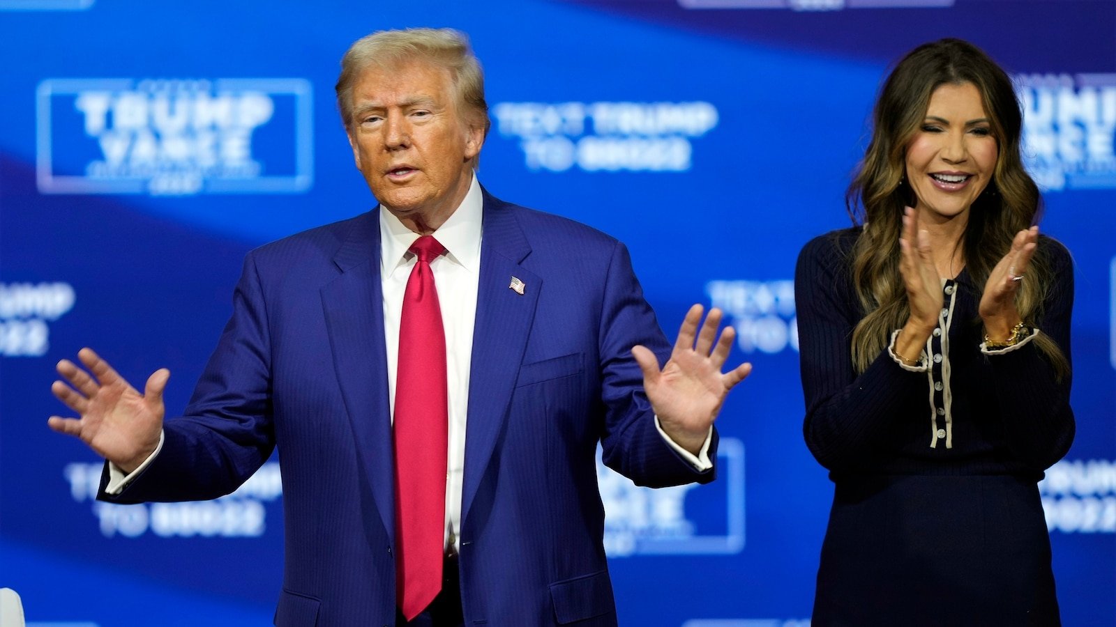 Former Republican President Donald Trump speaks at a campaign town hall on Oct. 14, 2024, in Oaks, Pa., as moderator South Dakota Gov. Kristi Noem listens.