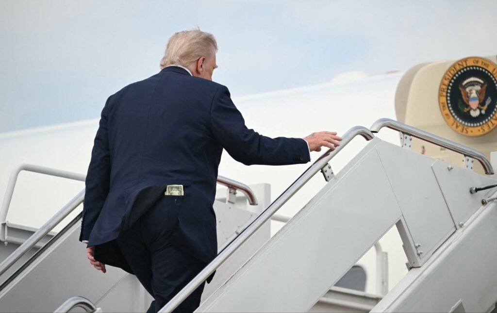 The $ 50 bill is considered in the posterior pocket of US President Donald Trump, when he is imprisoned by the air force, one to depart from the joint base of Andrewn, May 1, 2025.