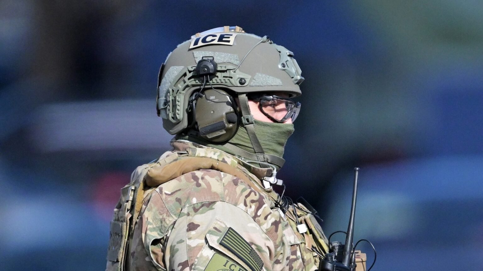 A member of U.S. immigration and customs enforcement members are ready to act in full tactical gears on February 5, 2025, at Denver, Colorado.