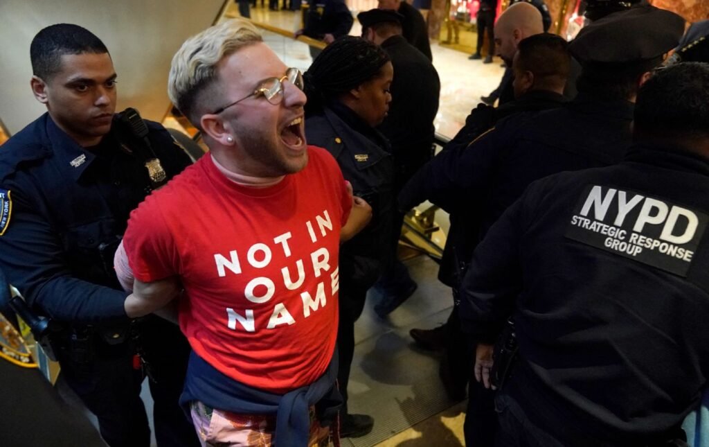 Demonstrators from a human rights organization of the Jewish vote are delayed by NYPD officers when they carry out civil disobedience to Trump -Treaty in New York on March 13, 2025.