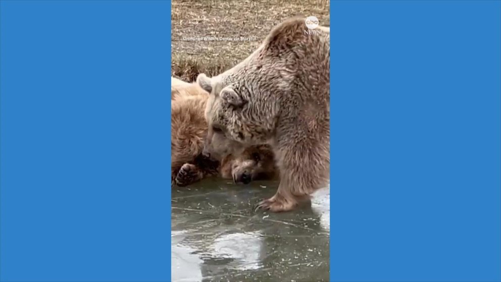 Two Syrian brown bears enjoyed a frozen pond at a New York sanctuary. One of them was seen licking, spinning and jumping on the ice