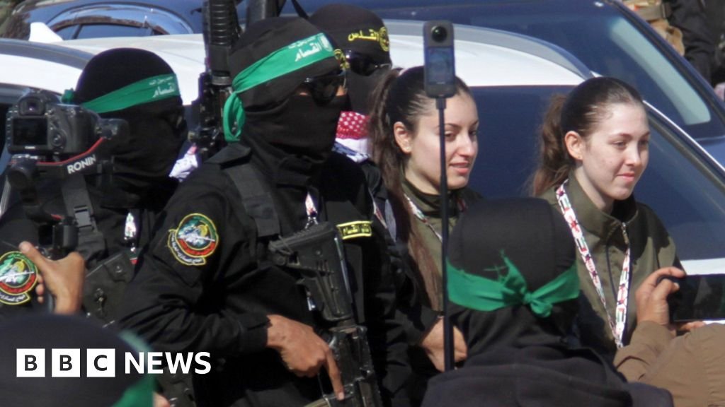 Video from Gaza City shows four Israeli hostages being handed over to Hamas at gunpoint in a heavily staged ceremony and being carried into vehicles awaiting the Red Cross.