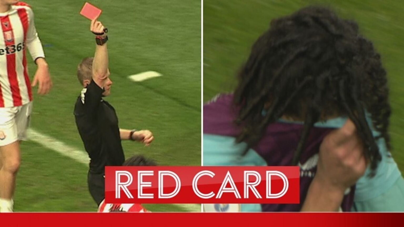 Burnley midfielder Hannibal Majbri has been sent off for a tackle on Stokes’ Junior Chamadeu.
