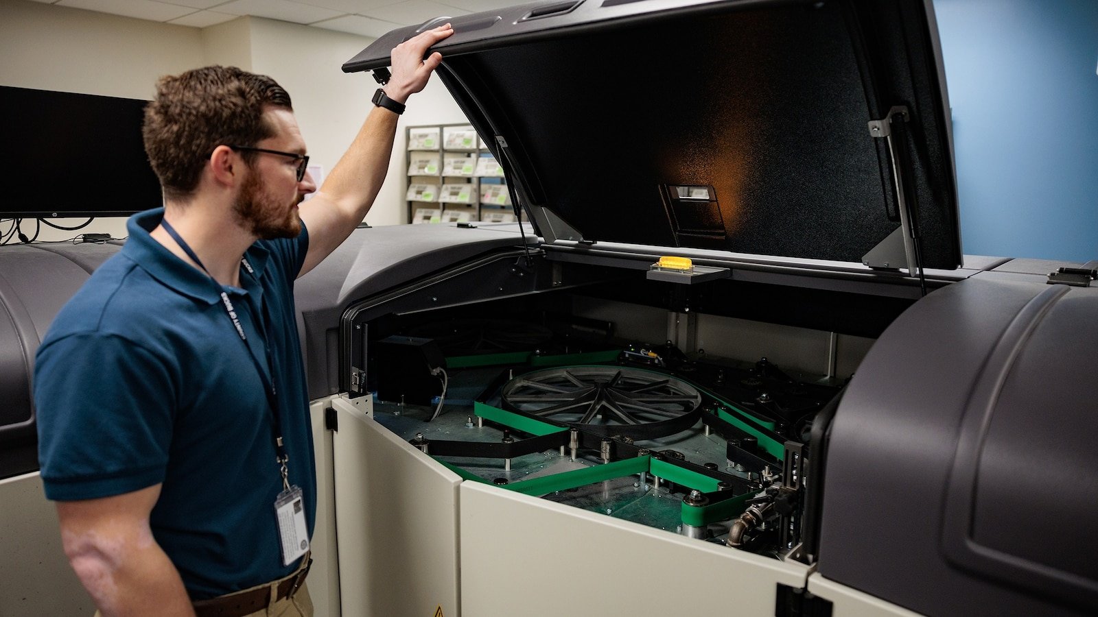 Board of Elections Director Tyler Burns holds a mail generator open at the board of elections office on Sept. 30, 2024, in Doylestown, Pa.